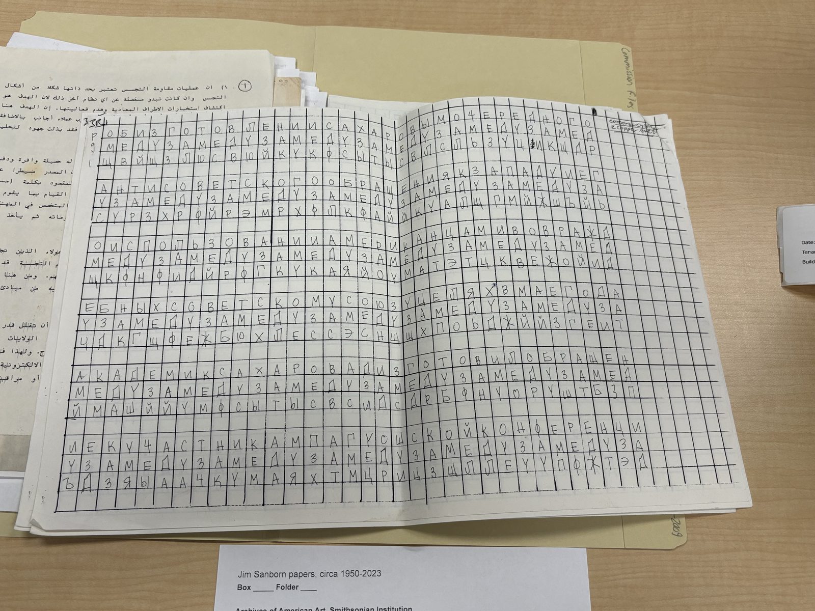 These images are presented in good faith for purposes of non-commercial research, scholarship, education, and commentary regarding the unsolved Kryptos K4 cipher. The Archives of American Art is a public research repository of the Smithsonian Institution; these materials were examined in person under standard research access procedures, and photographs were taken in accordance with the archive's research photography policies.