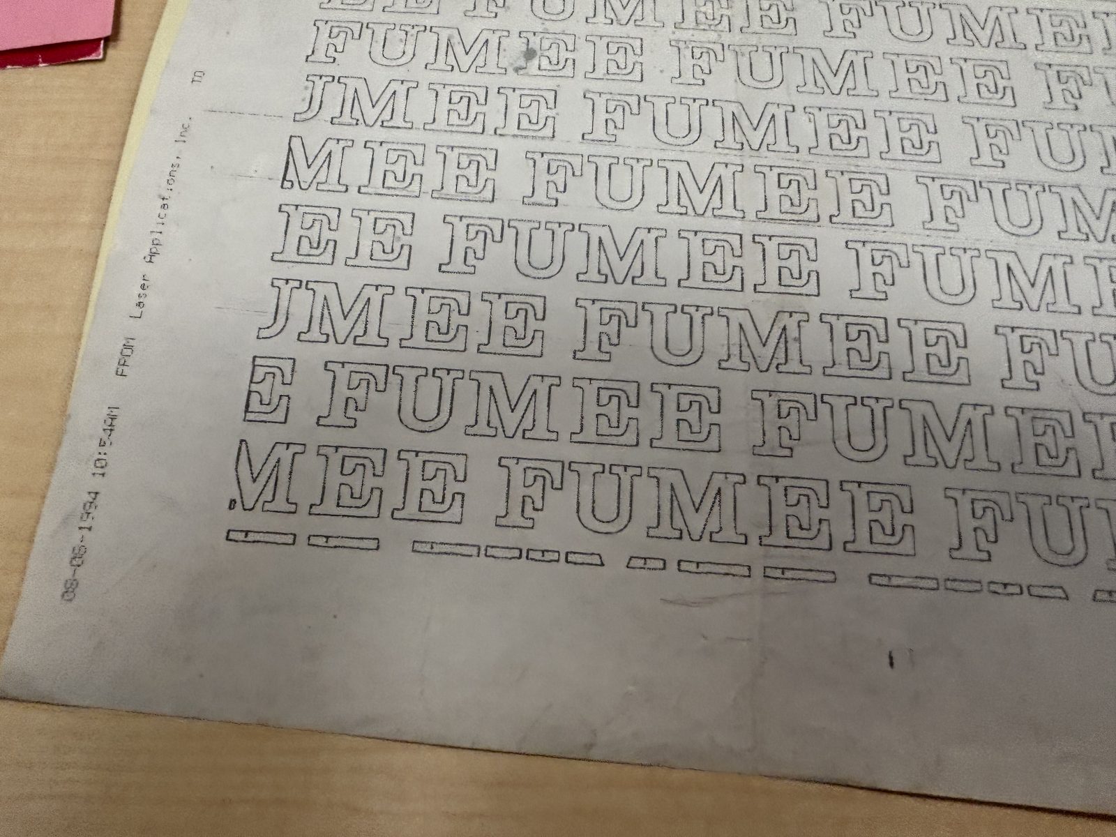 Fax from Laser Applications, Inc. filled with repeating “FUMEE” (French: “smoke”). A stencil cutting proof with thematic fill text resonating with concealment themes.