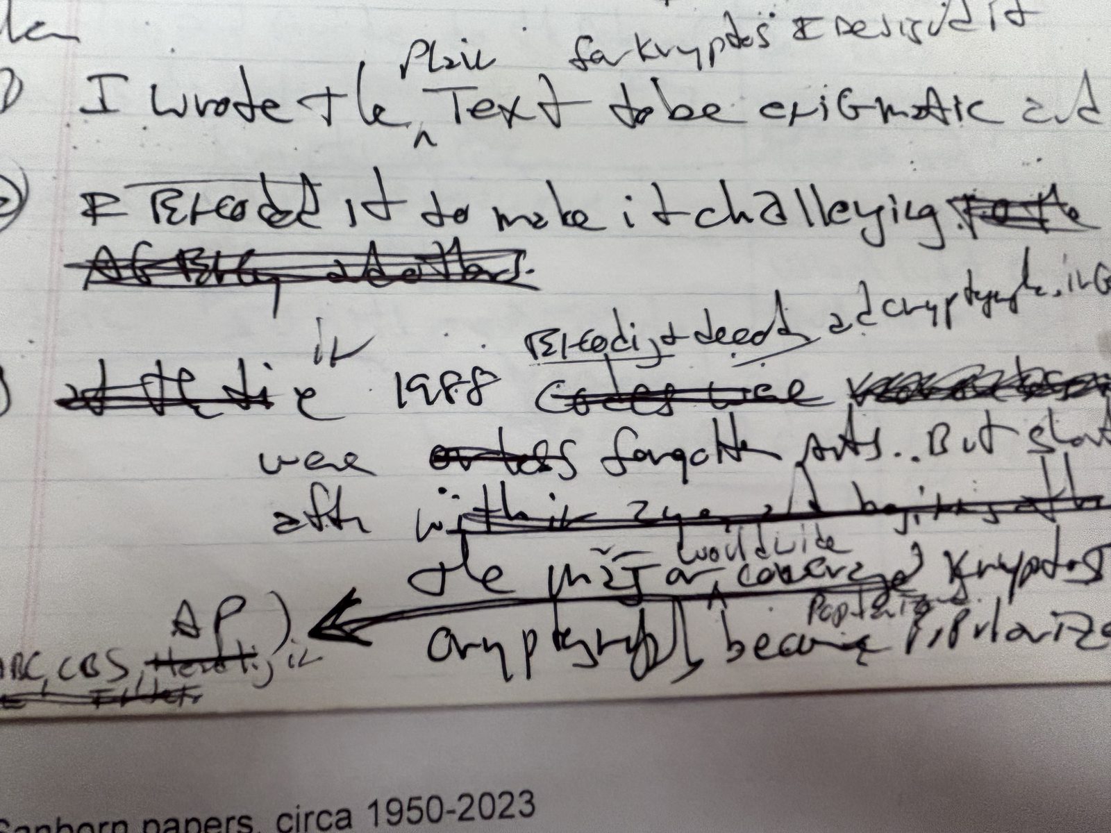 How to help: If you notice something in these images that we've missed, can provide a better transcription of any handwritten text, or can identify the source of any quoted material, please email contact@kryptosbot.com.