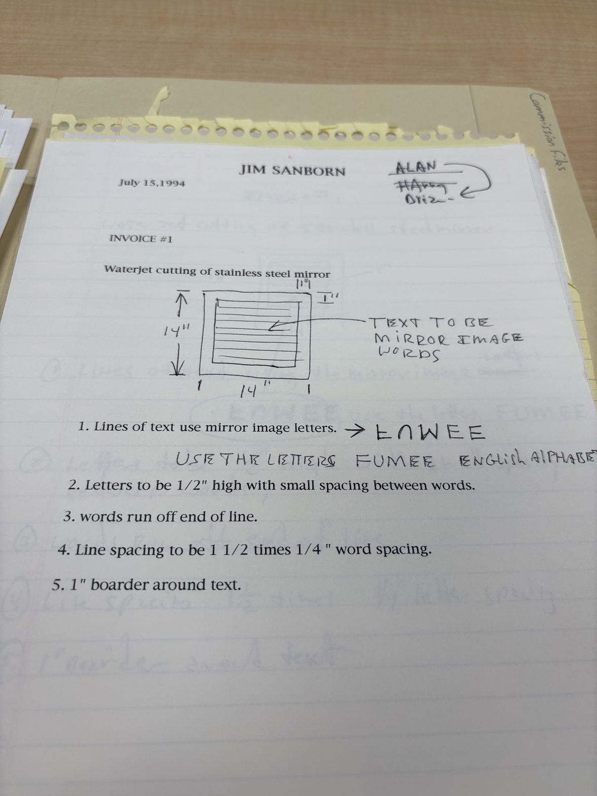 Invoice: “Waterjet cutting of stainless steel mirror.” Key spec: “TEXT TO BE MIRROR IMAGE WORDS” with “EAWEE” shown as mirrored FUMEE. Instruction: “USE THE LETTERS FUMEE ENGLISH ALPHABET.” Confirms Sanborn used mirror-reversed text as a technique. Dimensions: 14″×14″, letters 1/2″ high.