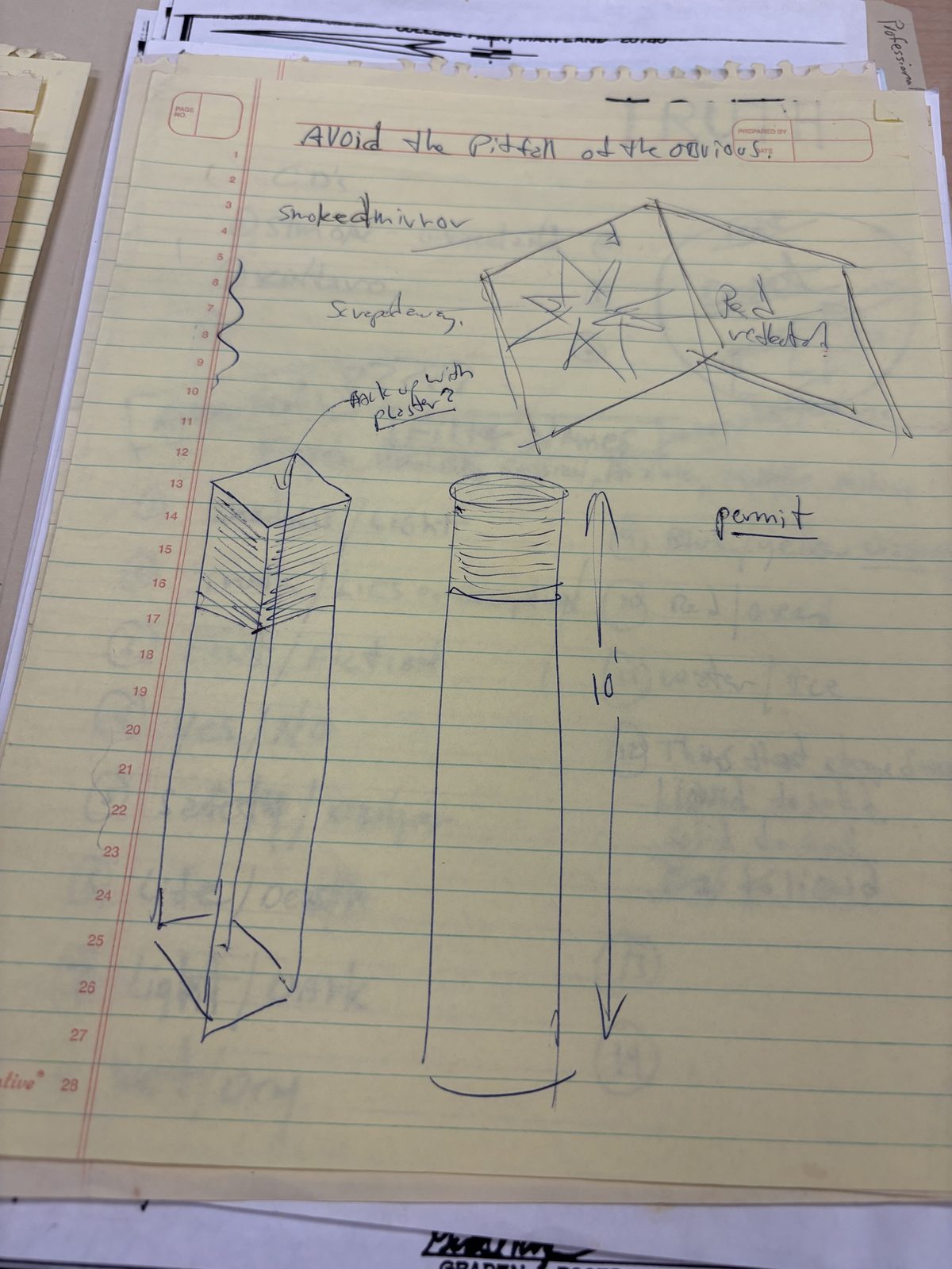 Sanborn's design maxim. Below: sketches of sculptural forms including a cylinder and star/compass element.