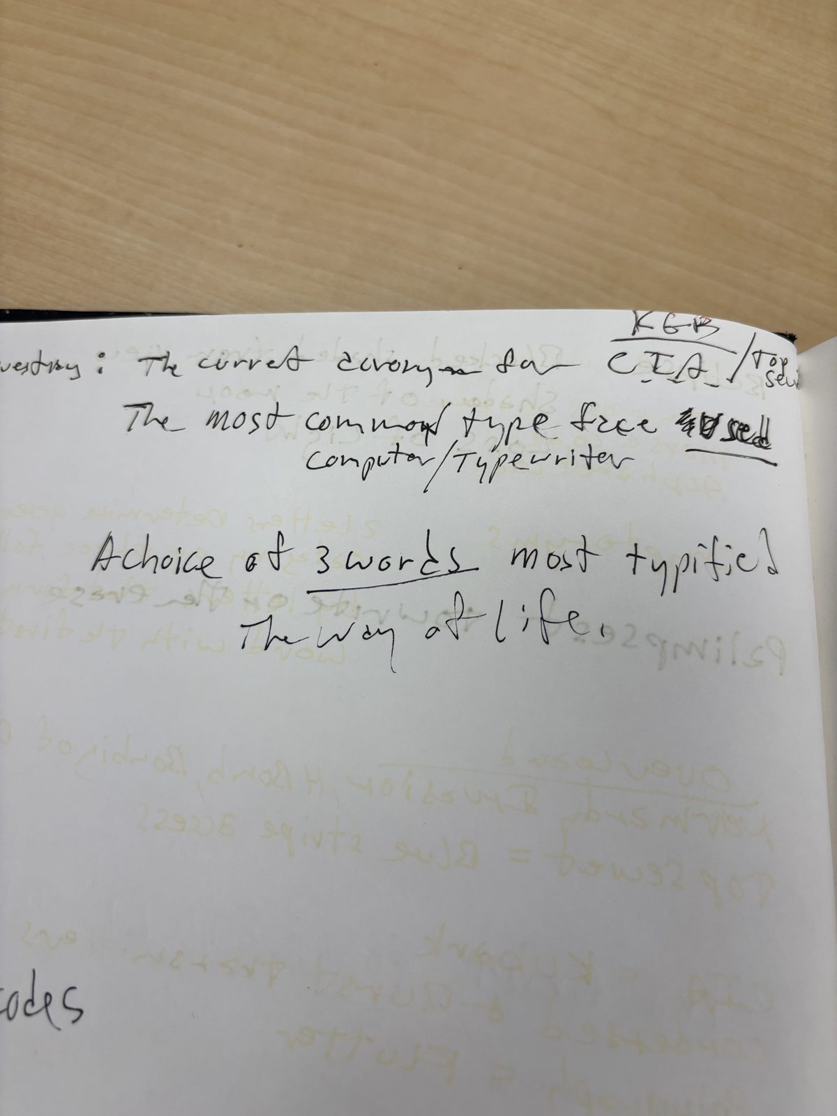 This could refer to three keywords for the cipher (KRYPTOS, PALIMPSEST, ABSCISSA?), three thematic concepts of espionage, or three words that characterize the intelligence world. The page also references “The current acronym for CIA” / “KGB” / “Top Secret” and “The most common type free [text] / Computer/Typewriter.” Faded pencil text including “Palimpsest” is visible in the lower portion.