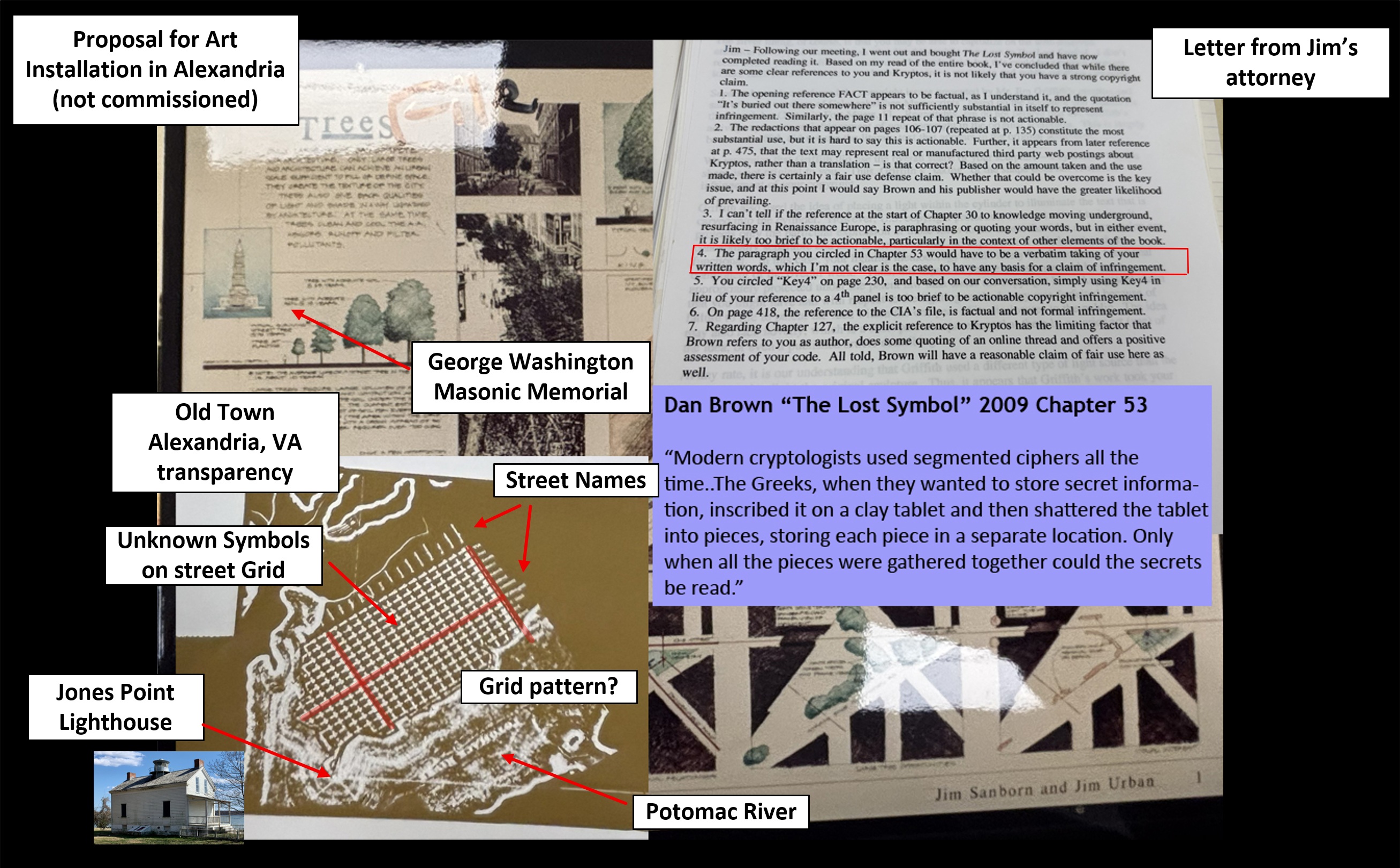 Throughout The Lost Symbol, Brown refers to Kryptos by name and quotes it directly. Chapter 53, however, never mentions Kryptos, yet Sanborn circled it and flagged it for his lawyer. The chapter describes a 4×4 cipher square, “segmented ciphers” from ancient Greece, a “Masonic pyramid,” and the idea that a puzzle can only be solved by combining two separate elements. Sanborn grew up in the Alexandria–Arlington area. The Old Town Alexandria transparency in his Kryptos working papers (IMG_1221) points toward Jones Point, the original DC boundary marker, and the George Washington Masonic National Memorial. This composite collects the relevant archival and reference materials in one view.