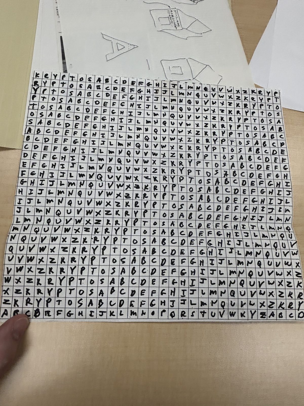 The physical 26×26 Vigenère tableau using the KRYPTOS keyword-mixed alphabet (KA). This is the encryption tableau for K1–K3 (Quagmire III variant). The large letter “A” is visible at top, and a sketch of the sculpture form appears above. The community has long known the tableau structure from cryptanalysis; this is the original working document.