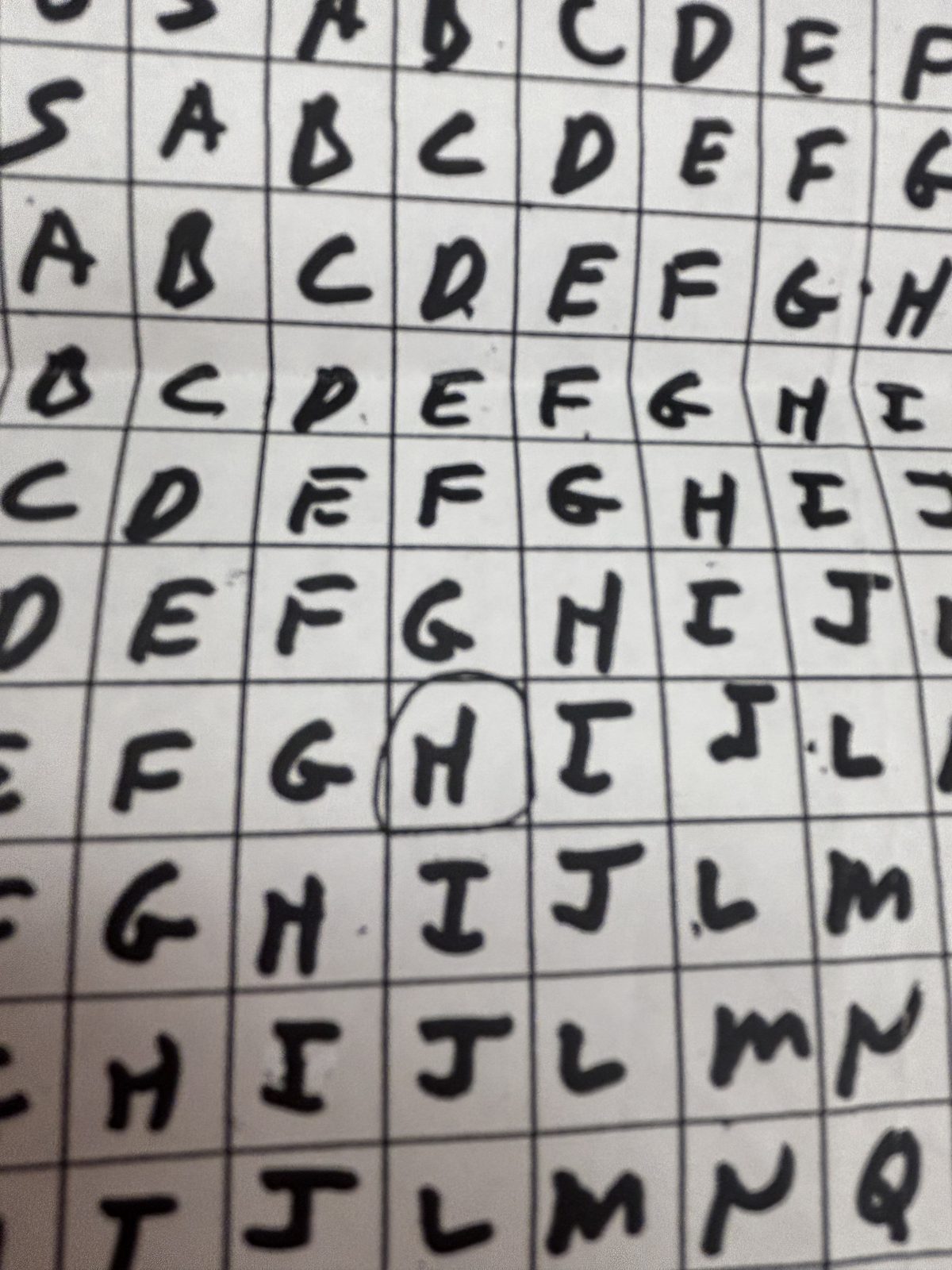 Close-up of the KA tableau showing individual handwritten letters. A circled “H” is visible. Circled letters may mark specific lookup operations performed during encryption.