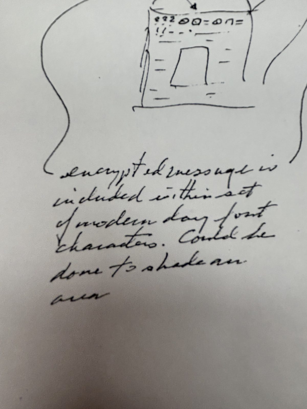 The encrypted message is hidden within a larger character set, and a physical overlay (“shade an area”) reveals which characters carry meaning. Compare to the ECLIPSE definition in IMG_1566: “Blocked, shaded from view.” A sketch of a sculptural form appears above the text; it is not certain whether this depicts Kryptos or another work.