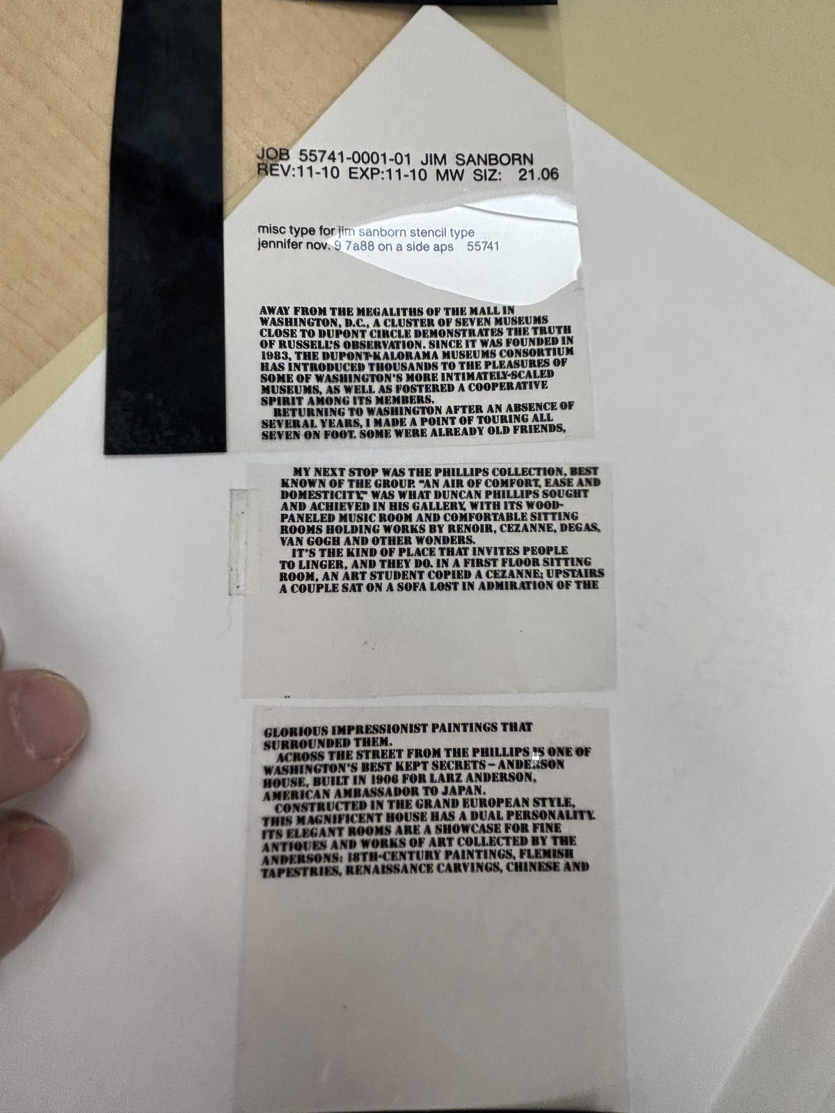 Documents related to physical production: stencil orders, waterjet cutting specifications, source texts, and material samples.
