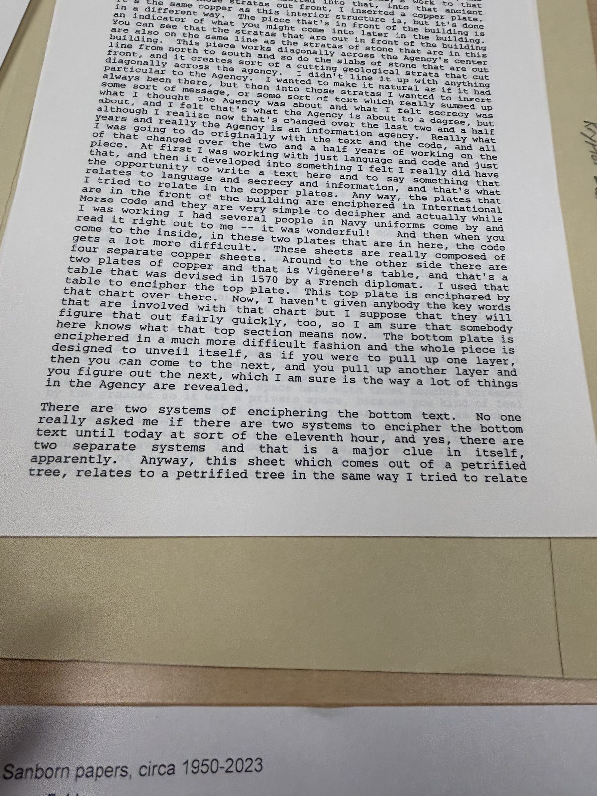 Primary source documents in which Sanborn describes his creation process, including working notes and the CIA dedication ceremony transcript (the ceremony speech is publicly available through other sources; the physical document provides context for surrounding annotations).