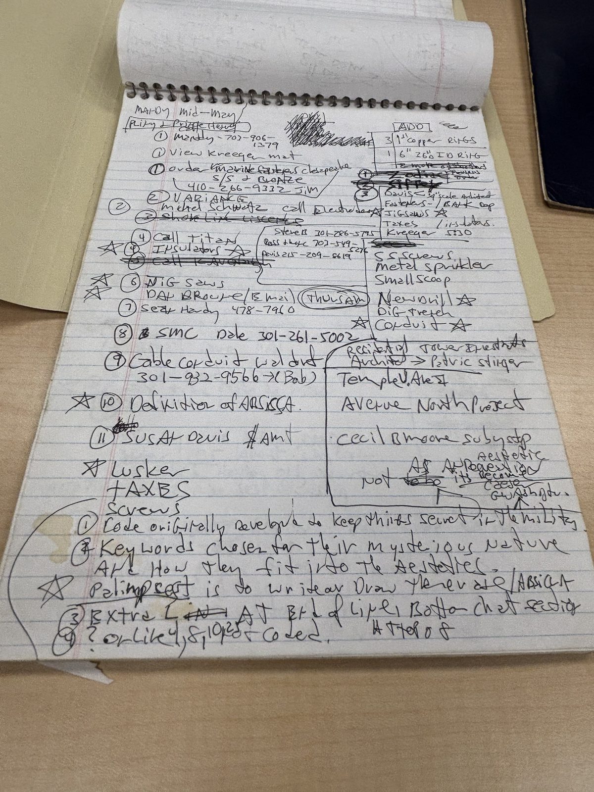 In March 2026, we examined the Jim Sanborn papers at the Archives of American Art, Smithsonian Institution. The collection spans circa 1950–2023 and includes working cipher materials, design sketches, correspondence, production documents, and conceptual notes from Sanborn's career. This page presents a curated subset of photographs from our research visit, selected for their relevance to Kryptos and the unsolved K4 cipher. The selection prioritizes documents that reveal Sanborn's encryption thinking, keyword choices, construction methods, and conceptual framework.