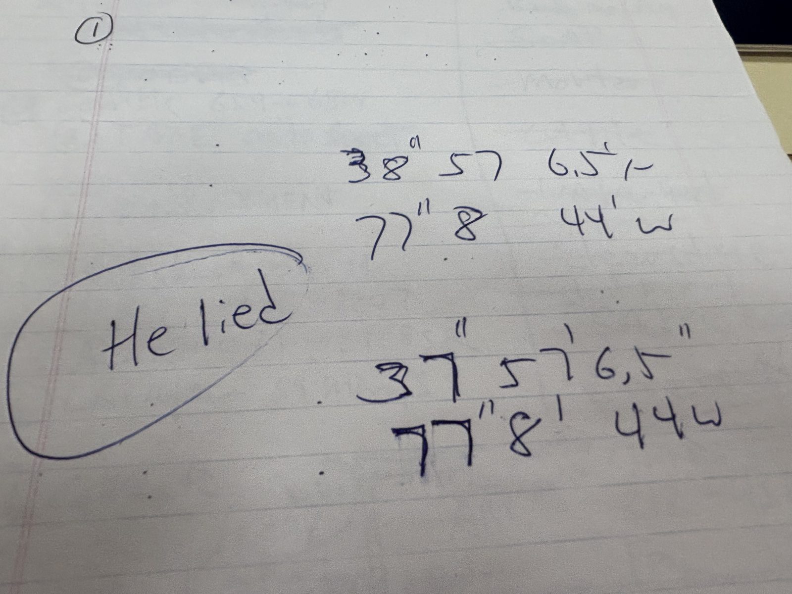 Two coordinate sets in Sanborn's hand with “He lied” circled emphatically between them: