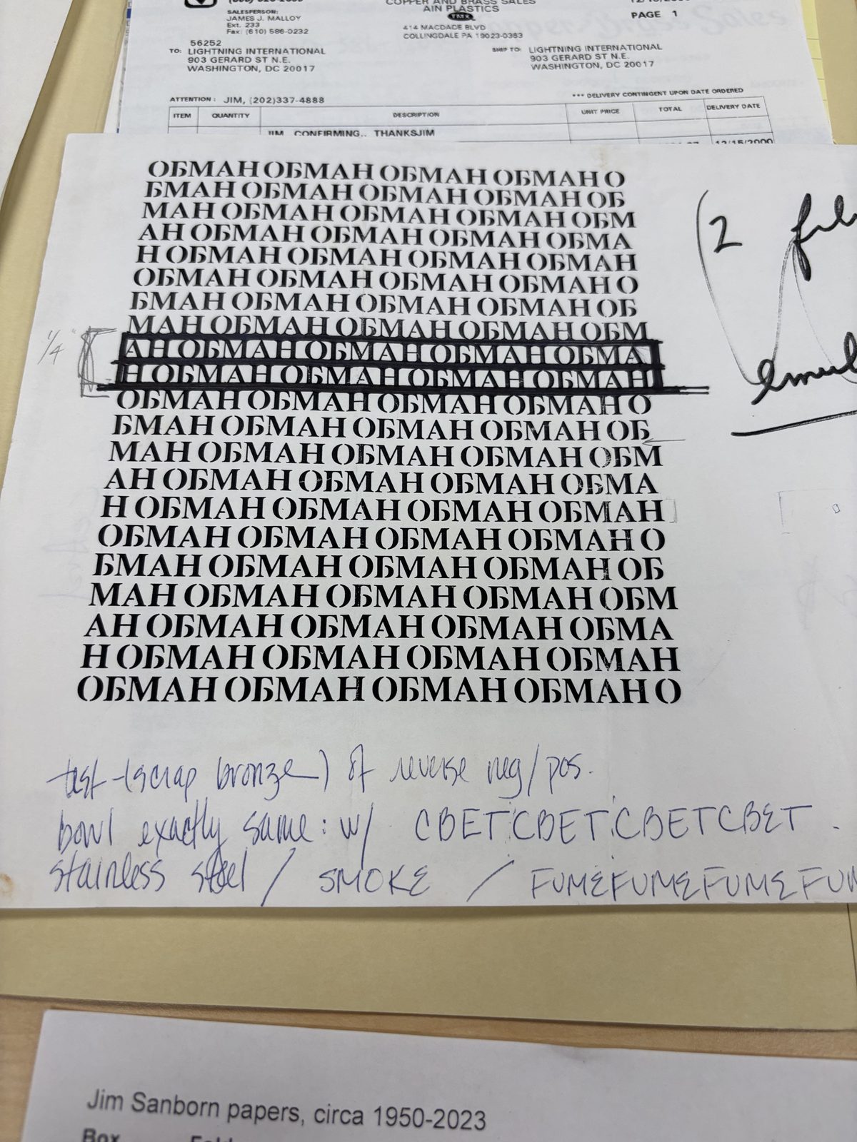 Stencil sheet with repeating Russian “ОБМАН” (OBMAN = “deception”). Handwritten notes: “bowl exactly same,” “SVET” (light), “FUME.” Deception as fill text alongside smoke.