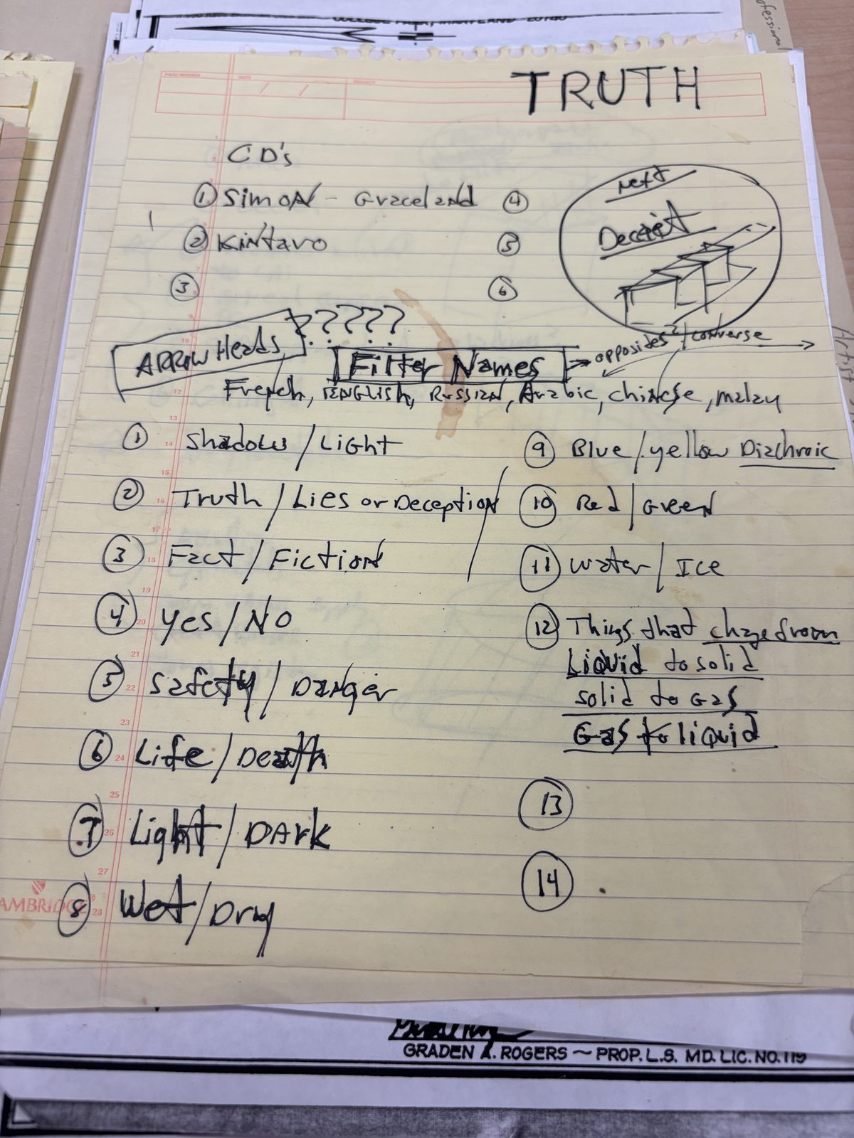 Dichotomy pairs: Shadow/Light, Truth/Lies, Fact/Fiction, Life/Death, Light/Dark, Blue/Yellow Dichroic, Red/Green. Also: “Filter Names: French, English, Russian, Arabic, Chinese, Malay.”
