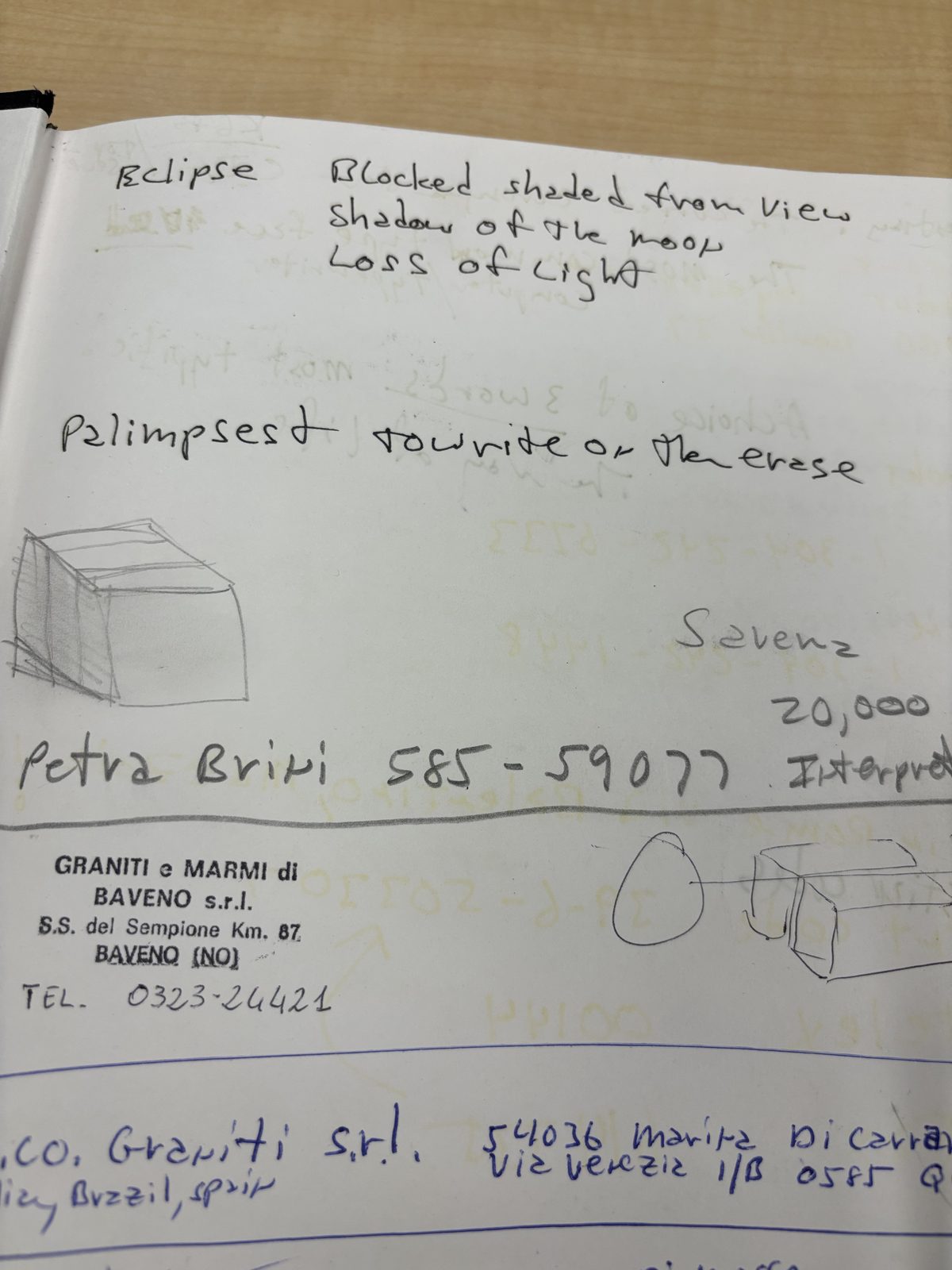 ECLIPSE could be a keyword candidate or describes the concept of hiding information. “Blocked, shaded from view” maps directly to the steganographic principle described in IMG_1236. The PALIMPSEST definition (“to write or to erase”) emphasizes the overwriting aspect. The page also contains Italian marble supplier contact information (Graniti e Marmi di Baveno), placing these notes in the material sourcing phase.