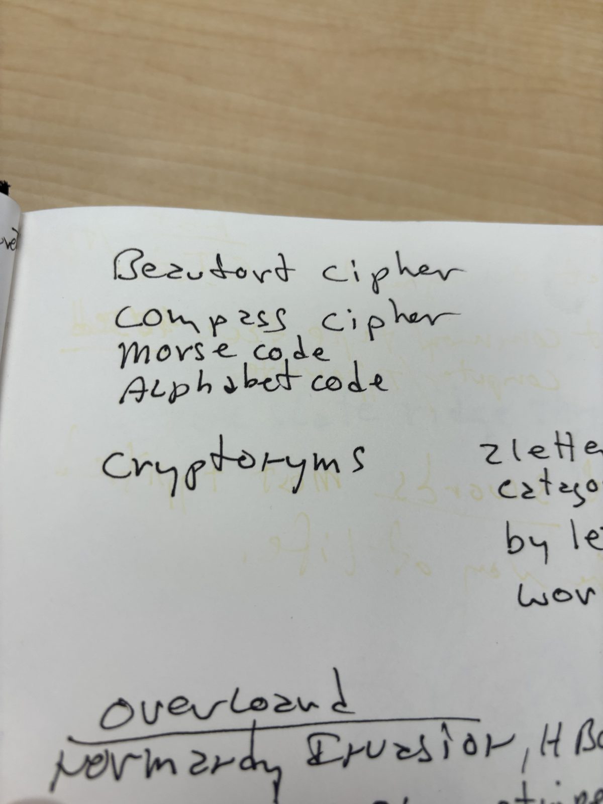 Sanborn's handwritten lists of cipher systems, intelligence terminology, and encoding methods. These reveal what he was taught and what he studied.