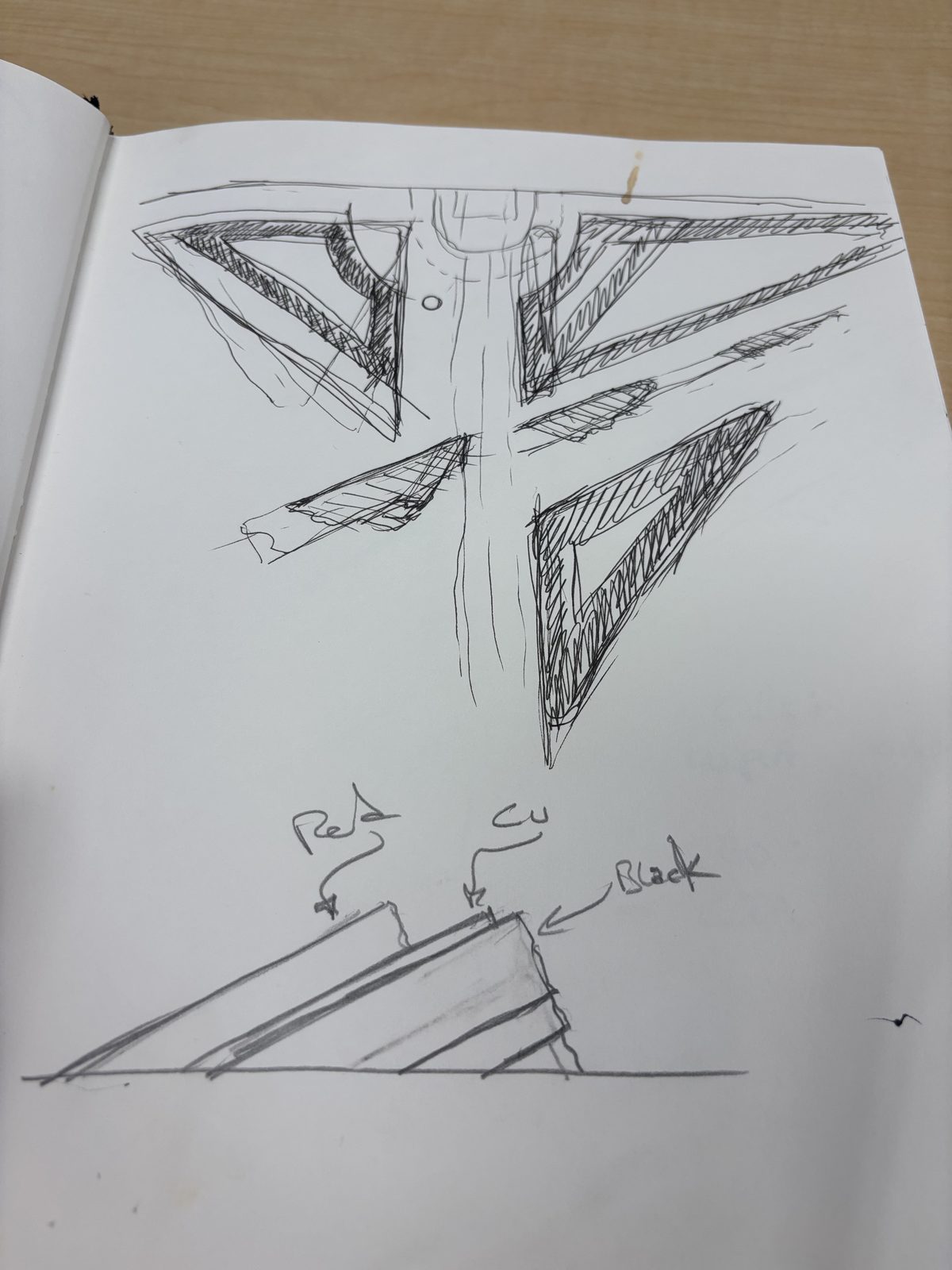 Sanborn's original concept sketch for the CIA courtyard installation showing the distinctive V-shaped/triangular Morse code table elements. A material cross-section at the bottom labels the layers: “Red” (granite), “Cu” (copper), “Black” (stone). These color assignments appear deliberate and meaningful. They also map to navigation marker colors (red = port, green/copper patina = starboard), reinforcing the nautical symbolism found elsewhere in the archive (see IMG_1428, IMG_1614).