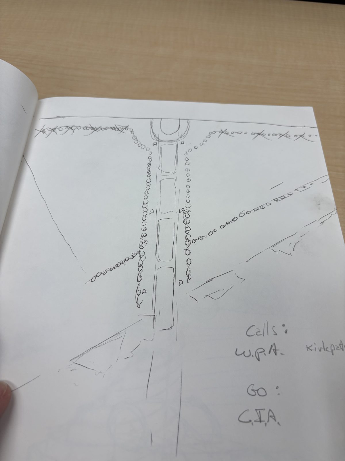 Conceptual site plan for the Kryptos courtyard installation at CIA headquarters. The S-curve copper panel is visible in the center, surrounded by walkways and landscape elements (circles may indicate petrified wood or stone placement). Annotations read “Cells: W.P.A. Kirkpatrick” and “GO: C.I.A.” This sketch shows the spatial relationships between the installation components.